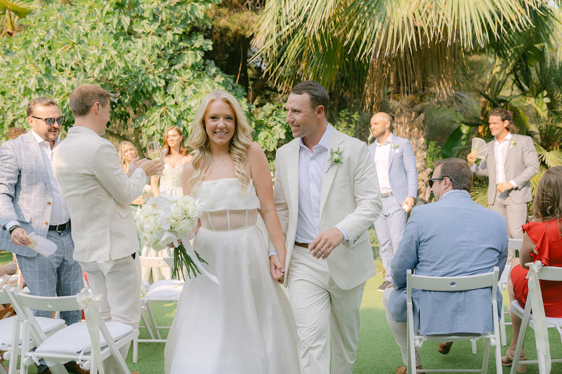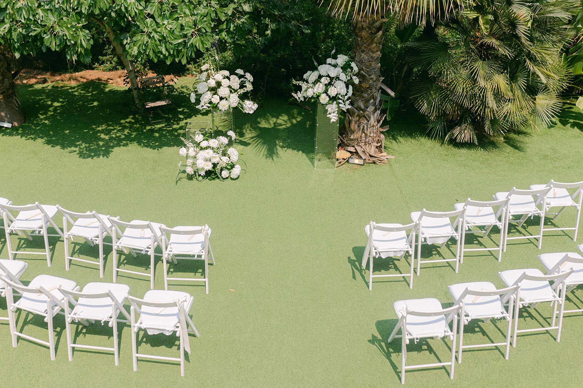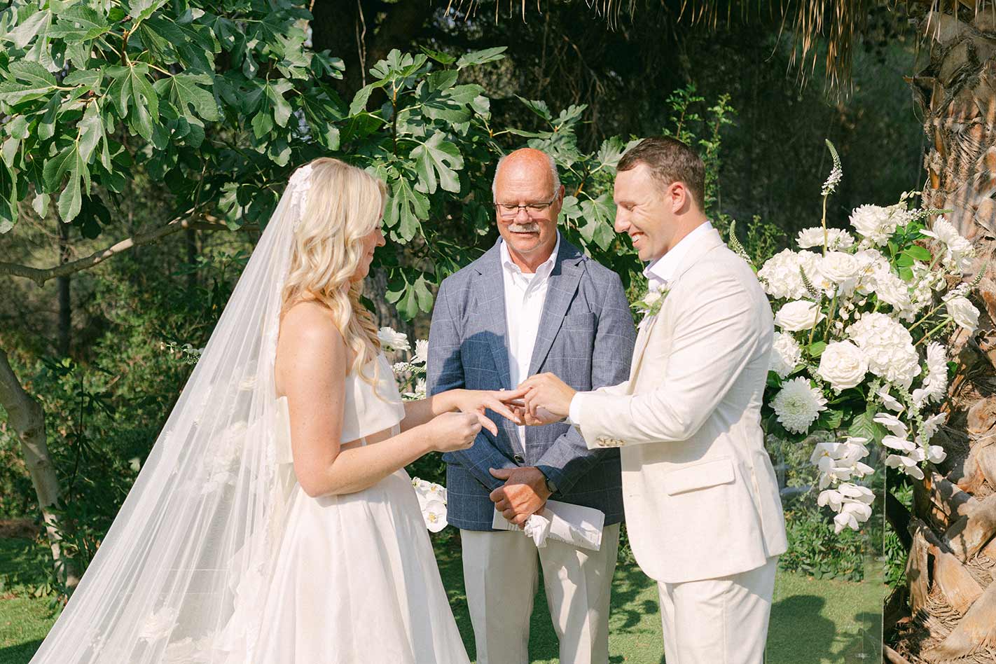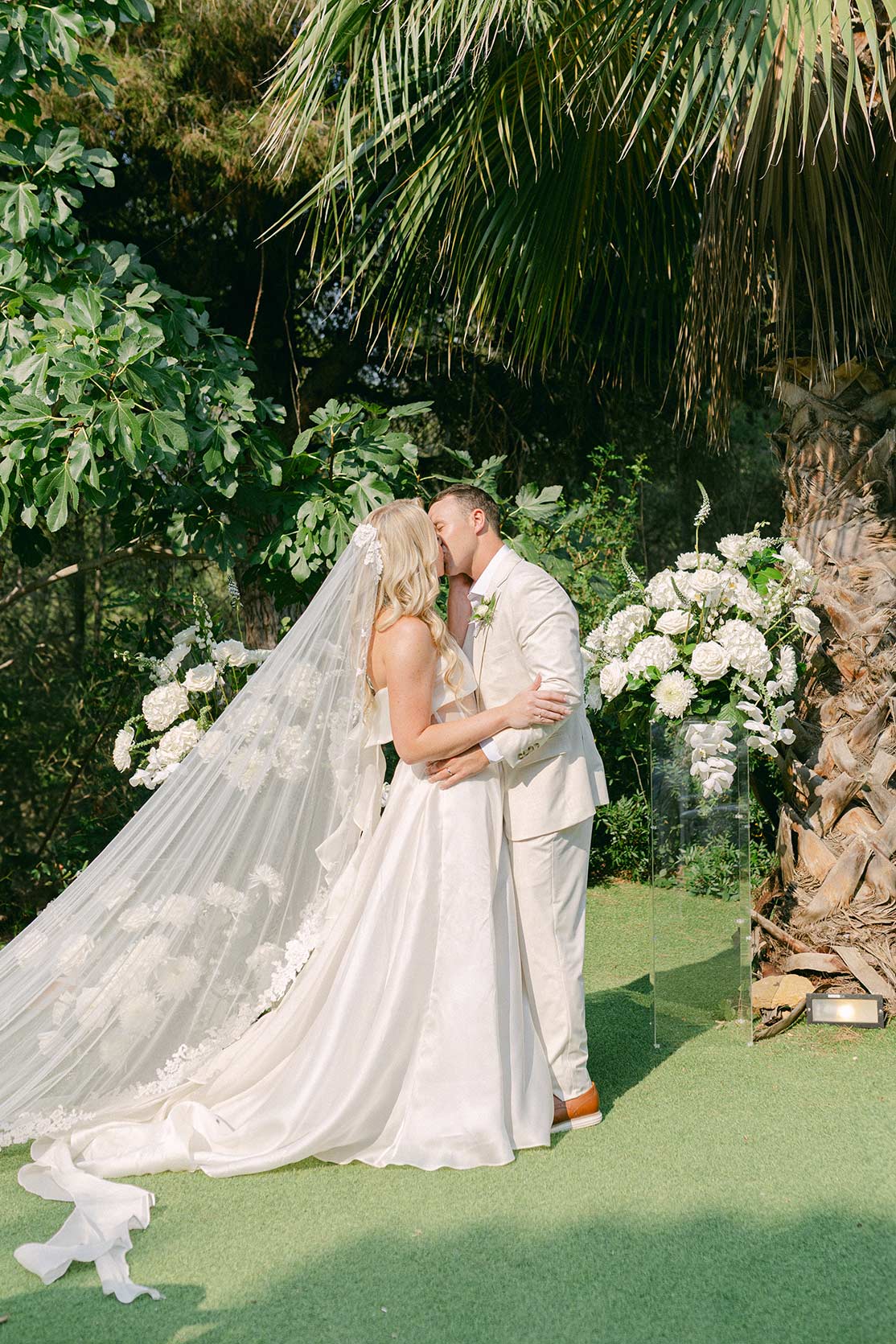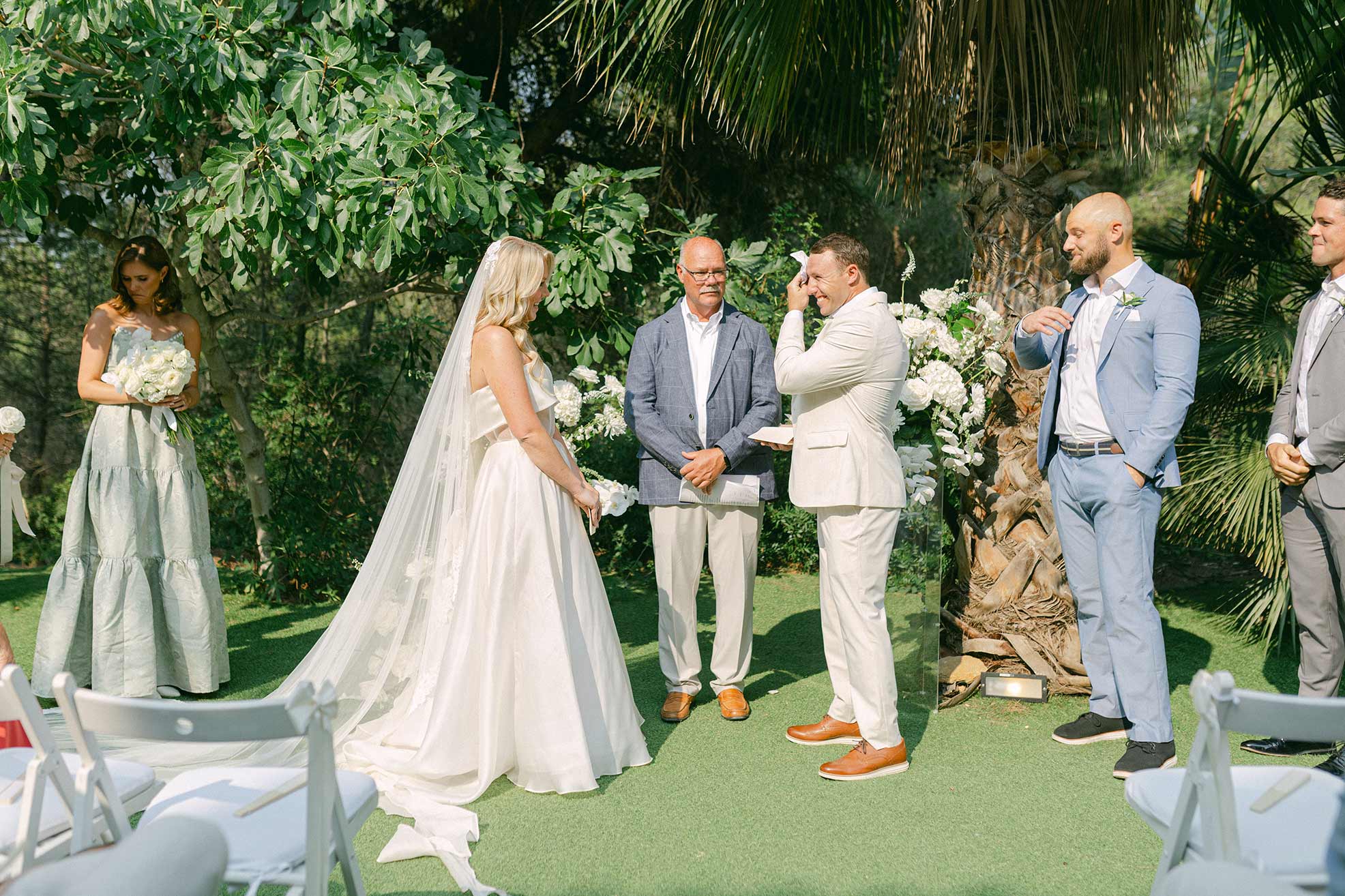 The ceremony unfolded surrounded by greenery, with delicate white florals framing the space and just twenty guests seated close enough to feel every word spoken.