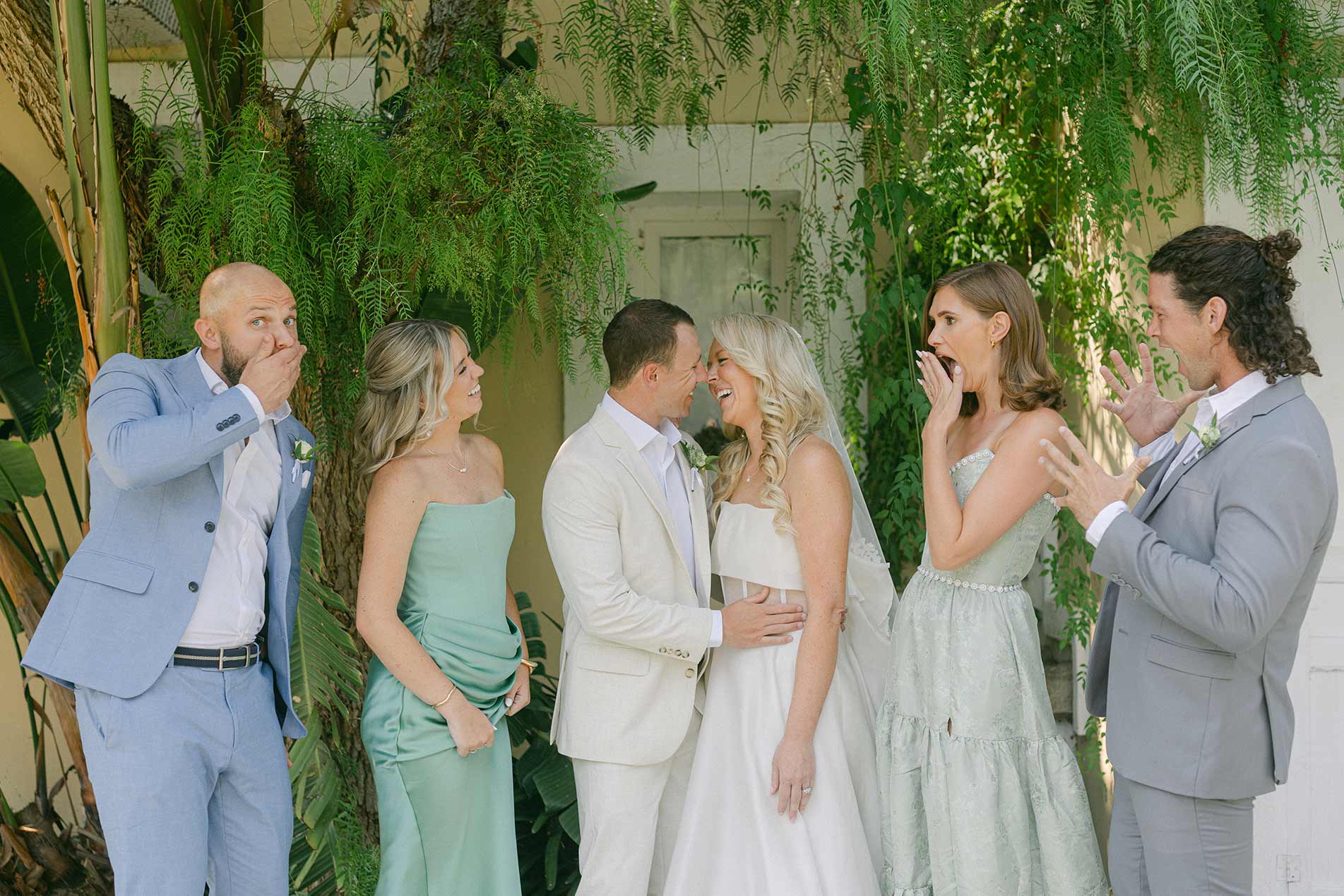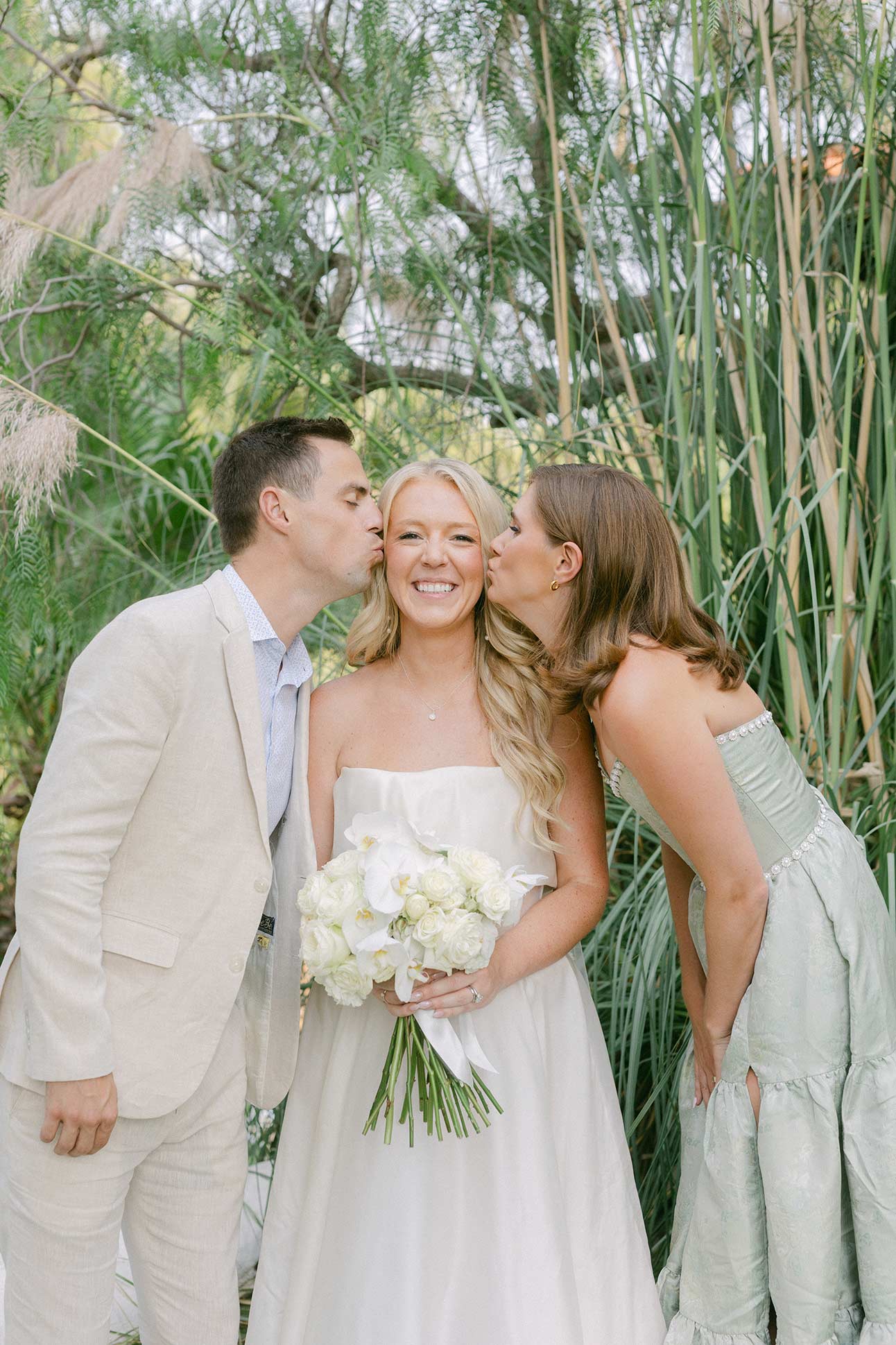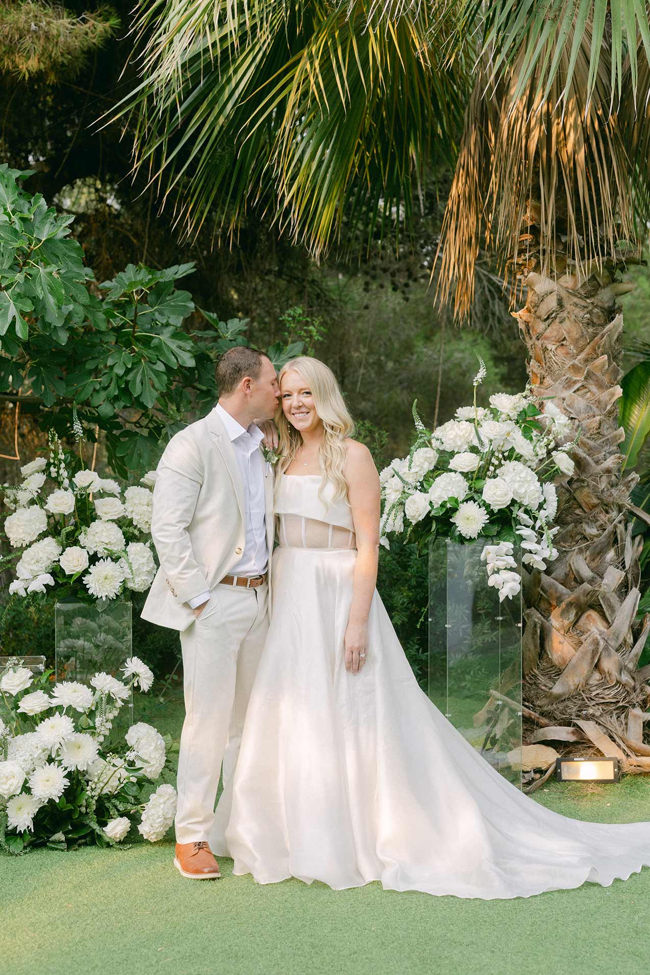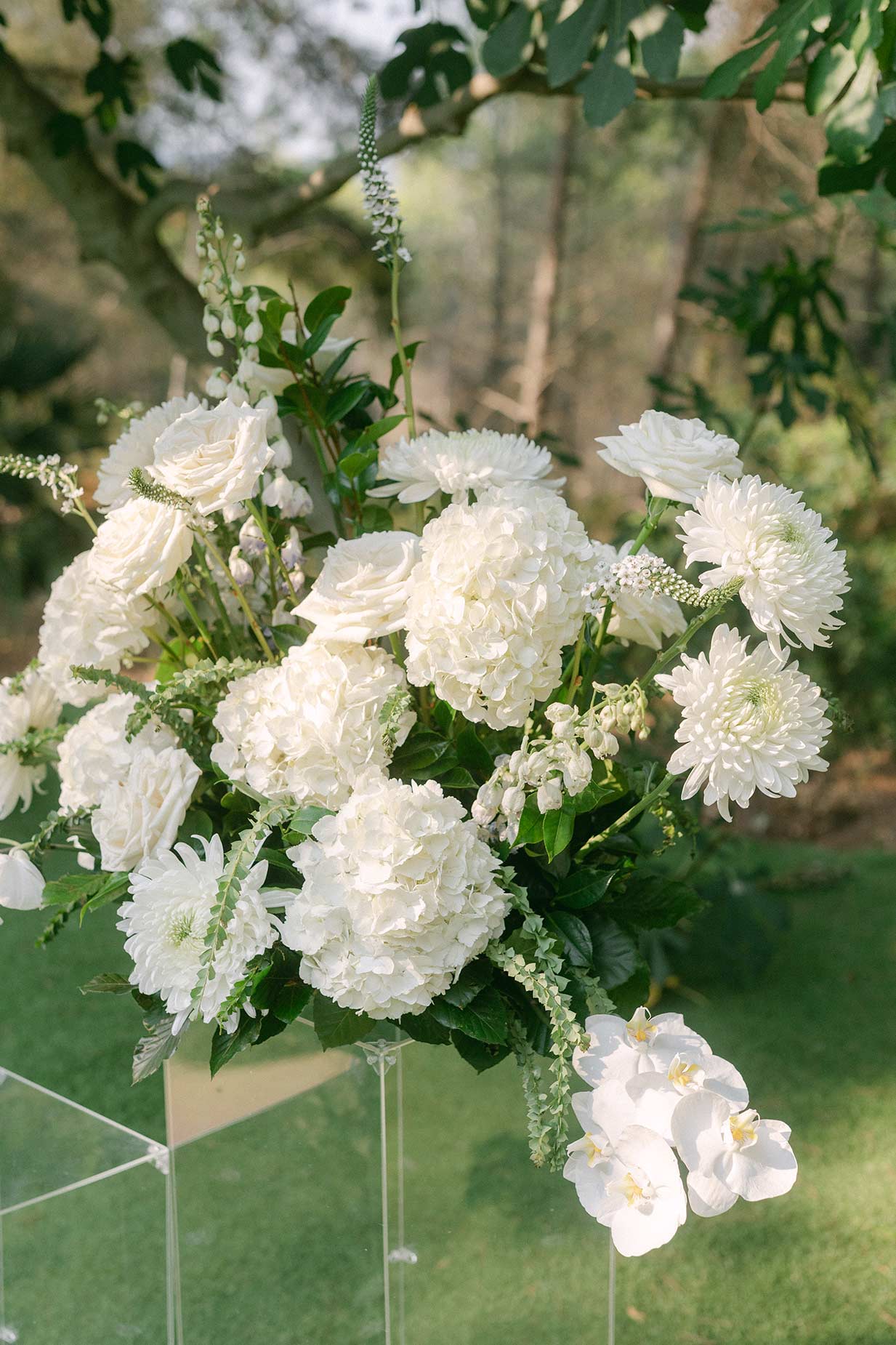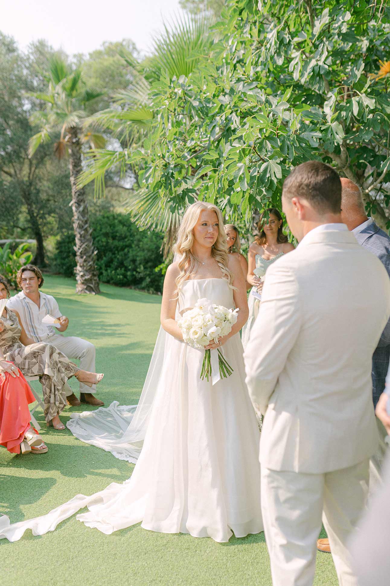 The ceremony unfolded surrounded by greenery, with delicate white florals framing the space and just twenty guests seated close enough to feel every word spoken.