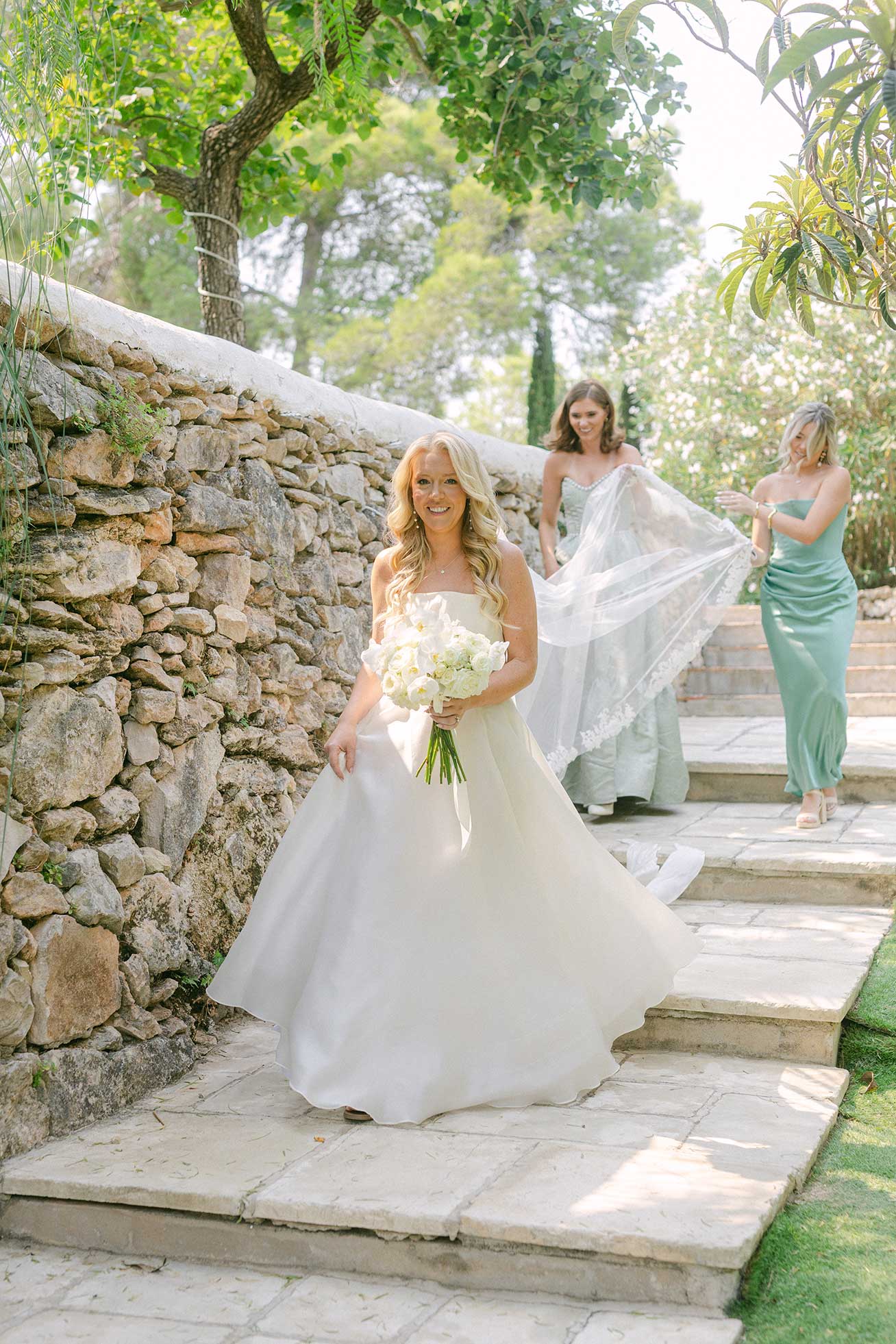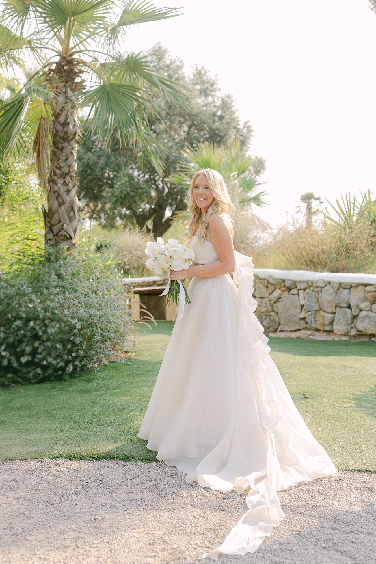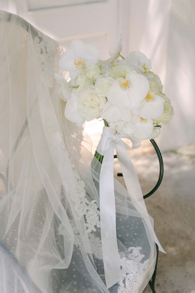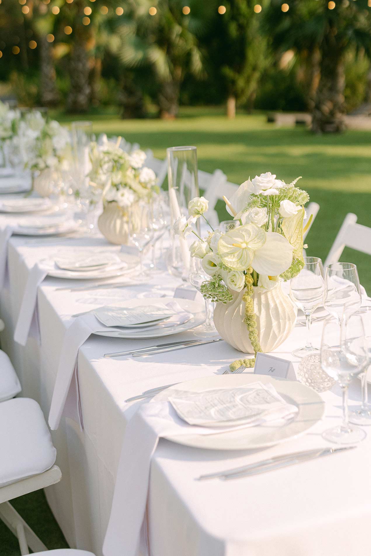 Casa Nova Estate provided exactly that: warm Mediterranean light, lush green backdrops, and an atmosphere that made everything feel intimate and alive. Airy florals in soft whites and pale blush tones complemented simple linens and clean table styling. Nothing felt excessive. Everything felt considered.