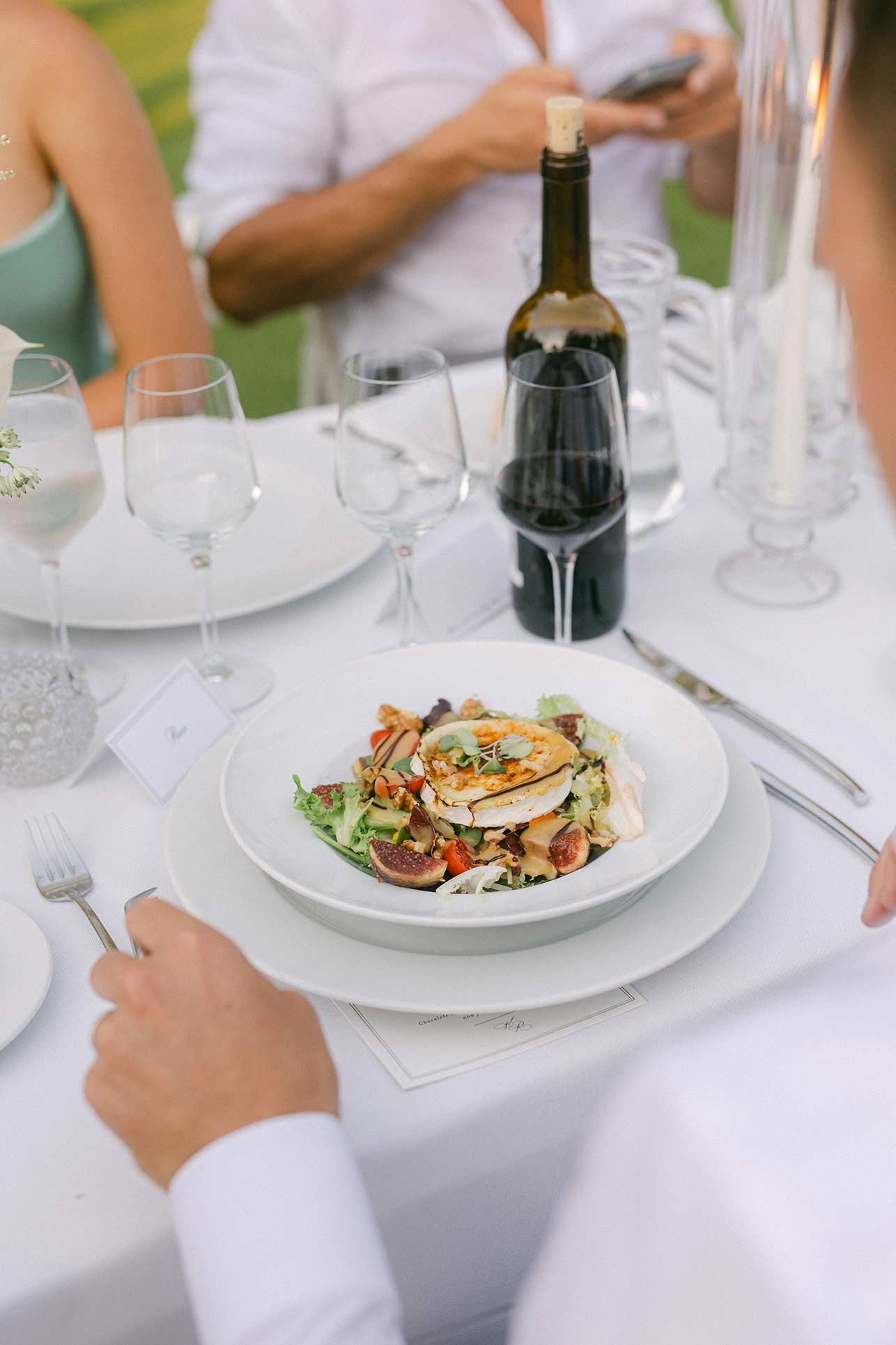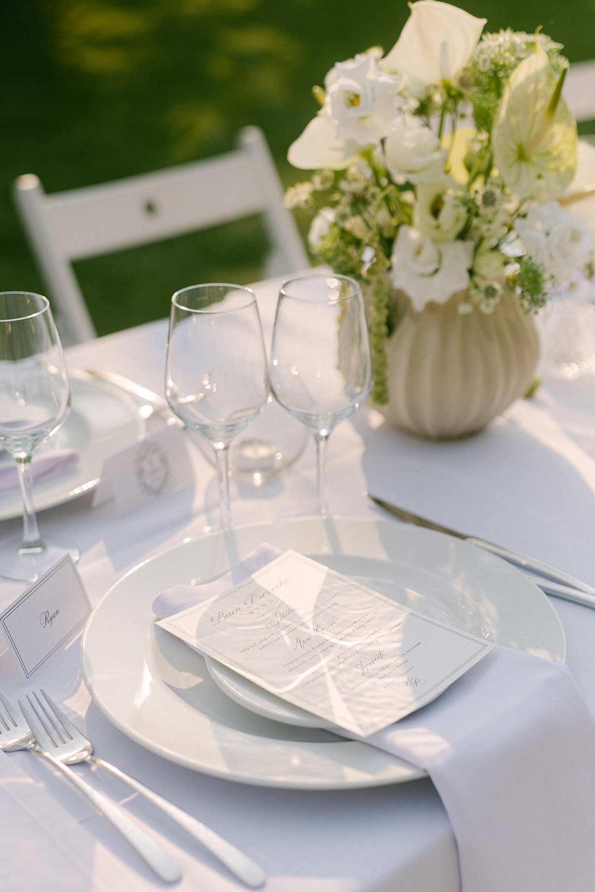 Long table was dressed in simple white linens, layered with thoughtful floral accents in soft whites and fresh greens. Nothing felt excessive, yet every detail was considered. Glassware caught the golden light and a single, beautifully set table allowed every guest to see one another, to share stories, laughter, and unhurried toasts.